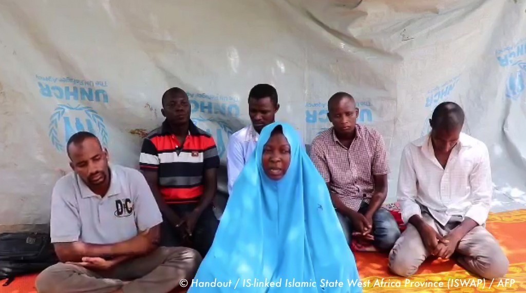 Le groupe nigérian de l’Etat islamique en Afrique de l’Ouest (Iswap), branche de Boko Haram affiliée à l’organisation Etat islamique (EI), a diffusé jeudi une vidéo dans laquelle une femme vêtue d’un hijab bleu clair affirme en anglais qu’elle est membre de l’ONG française et qu’elle a été enlevée avec ses cinq collègues, assis derrière elle sur la vidéo.