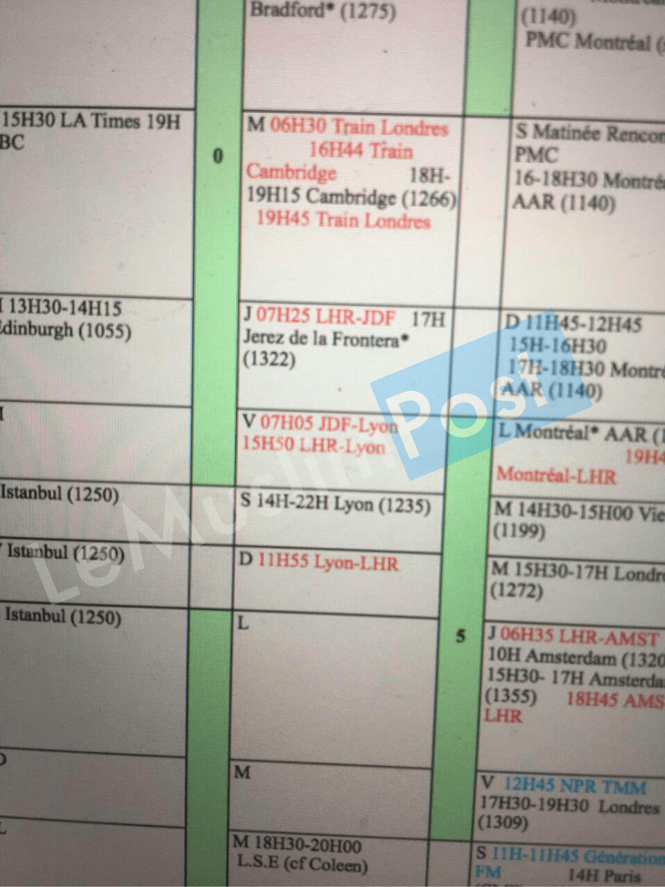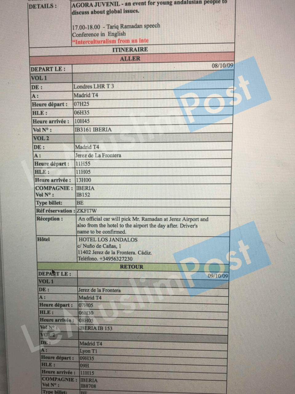 Le 15 septembre 2009, l’UJM (Union des jeunes musulmans) lance une invitation à Tariq Ramadan. Dans un mail adressé à son bureau, l’islamologue est invité à participer à une conférence, un cours et un débat qui auront lieu le 9 octobre. Après plusieurs propositions de vols Londres-Lyon et des discussions avec les organisateurs, le bureau du professeur d’Oxford finit par proposer un premier vol qui atterrirait le vendredi 9 octobre à 18h35. Tariq Ramadan repartirait alors le dimanche suivant. Mais dans un nouveau mail daté du 1er octobre, le bureau de l’islamologue écrit à l’UJM pour indiquer que Tariq Ramadan prendra finalement l’avion qui arrive à Lyon à 11h15, en provenance de Madrid et non plus de Londres. Le professeur prendra un vol de la compagnie Iberia pour se poser à Lyon en fin de matinée.