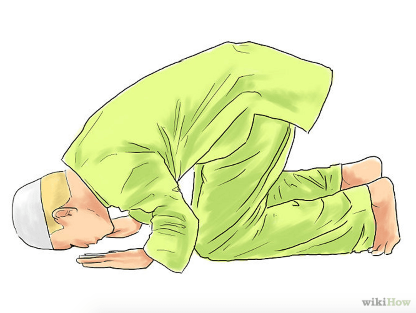 - Prosternez-vous et posez votre front, vos genoux et vos mains sur le sol, en disant «Allahu Akbar». Récitez ensuite «Soubhâna Rabbiya-l-‘a’lâ» («Gloire à mon Seigneur le Très-Haut») trois fois.