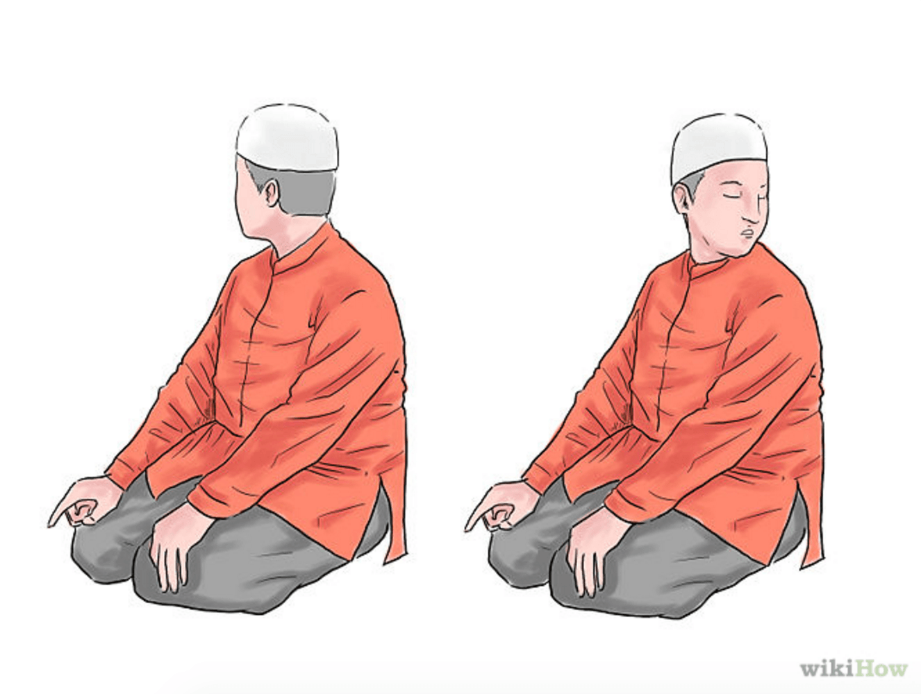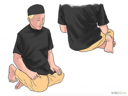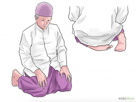 - Relevez-vous tout en restant assis et placez vos mains sur vos cuisses. Mettez votre jambe gauche à plat et votre pied droit à la verticale. Dites «Allahu Akbar». Reprosternez-vous de la même façon et dites «Soubhâna Rabbiya-l-‘a’lâ» («Gloire à mon Seigneur le Très-Haut») trois fois.