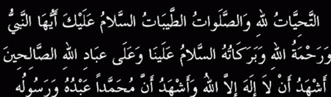 Attahiyatou lillah wa salawattou wa tayyibate, assalamou ‘alayka ayyouha nabiyyou wa rahmatou llahi wa barakatouh, assalamou ‘alayna wa ‘ala ‘ibadi llahi salihin, ach hadou alla ilaha illa llah, wa ach hadou anna Mohammadane ‘abdouhou wa rassoulouh.