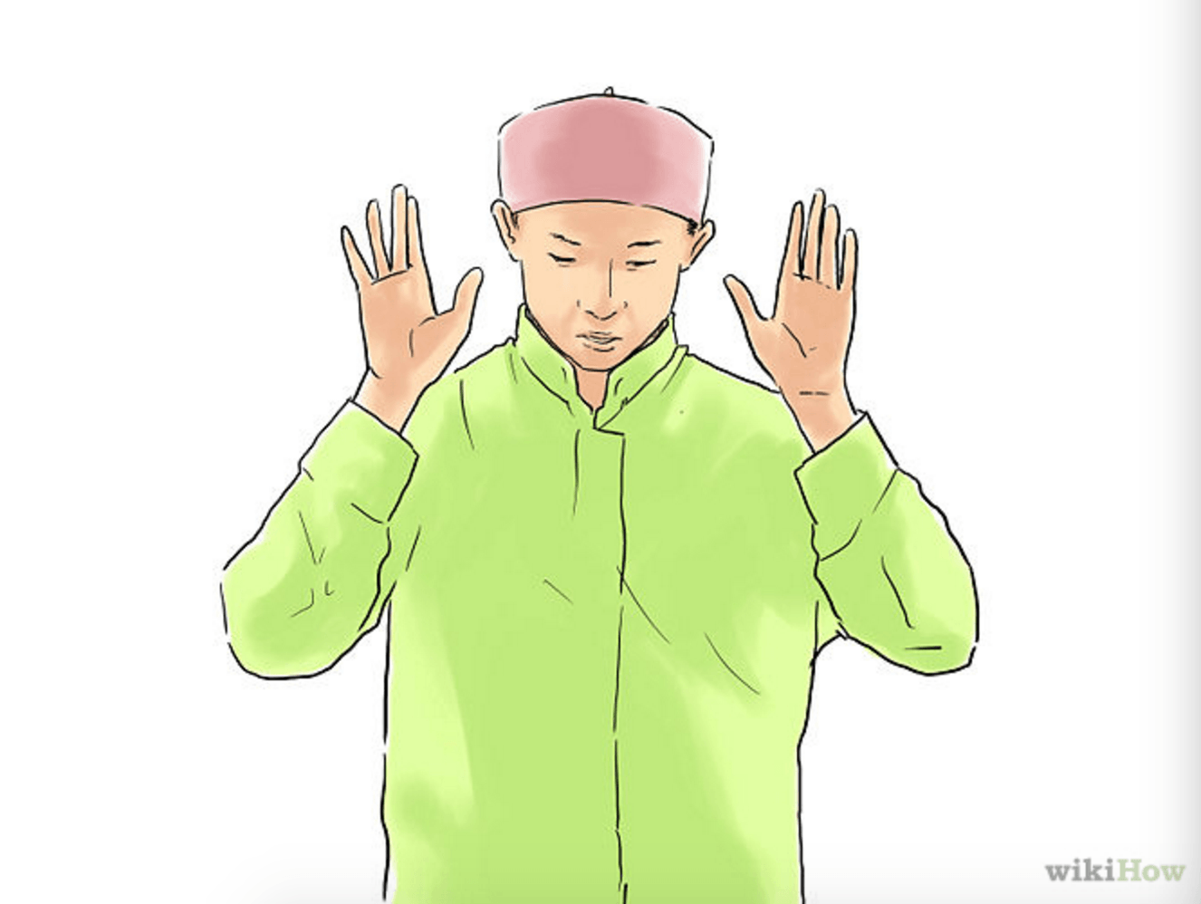 - Debout et tourné vers la Mecque, levez vos mains jusqu’aux oreilles, les paumes en avant, en disant «Allahu Akbar». En français, «Allah est le plus grand». Si vous êtes une femme, levez les mains à hauteur de vos épaules.