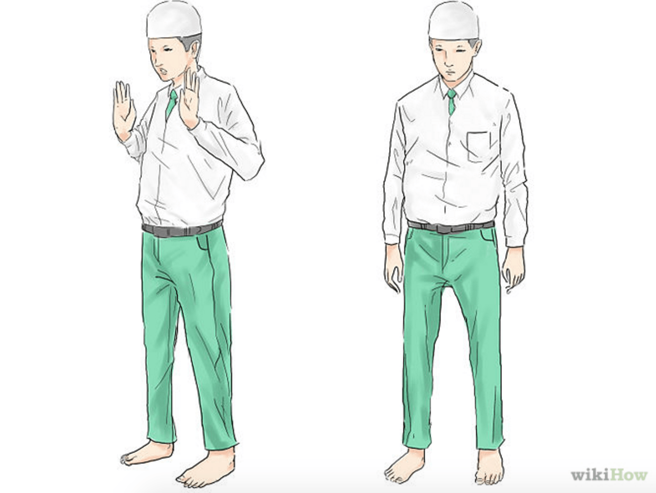 Placez votre main droite sur votre main gauche au niveau de votre nombril (pour les hommes), ou au niveau de votre poitrine (pour les femmes) et répétez la sourate Al-Fatiha.