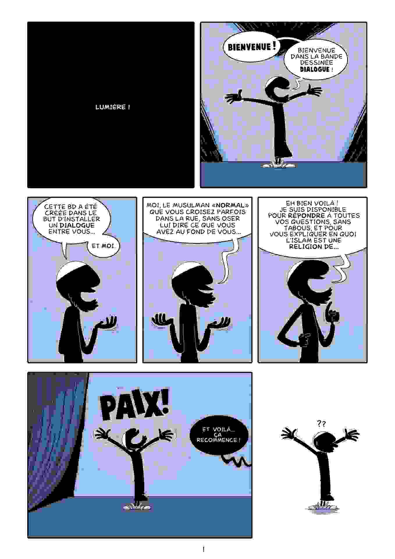 « Dialogue » est une future bande-dessinée, qui a pour objectif de répondre « de façon claire et sans tabous » aux interrogations sur l’Islam. Ce projet a été lancé par Norédine Alam, à l’origine de la série « Muslim Show », une série BD ayant pour but d’illustrer le quotidien des musulmans vivant en Occident et suivie par 2 millions de personnes dans le monde.