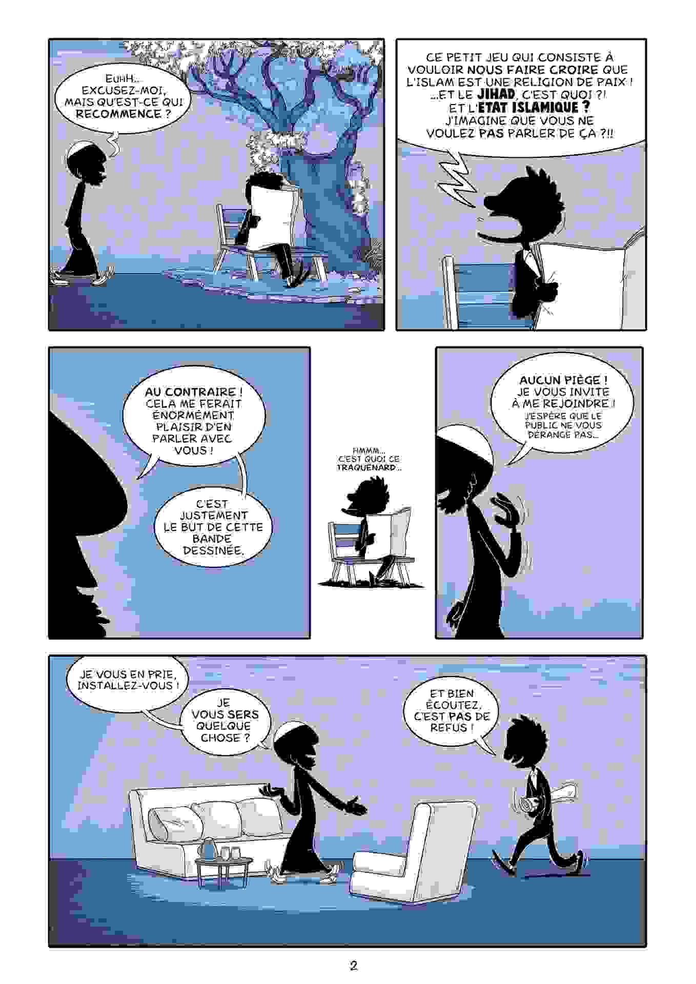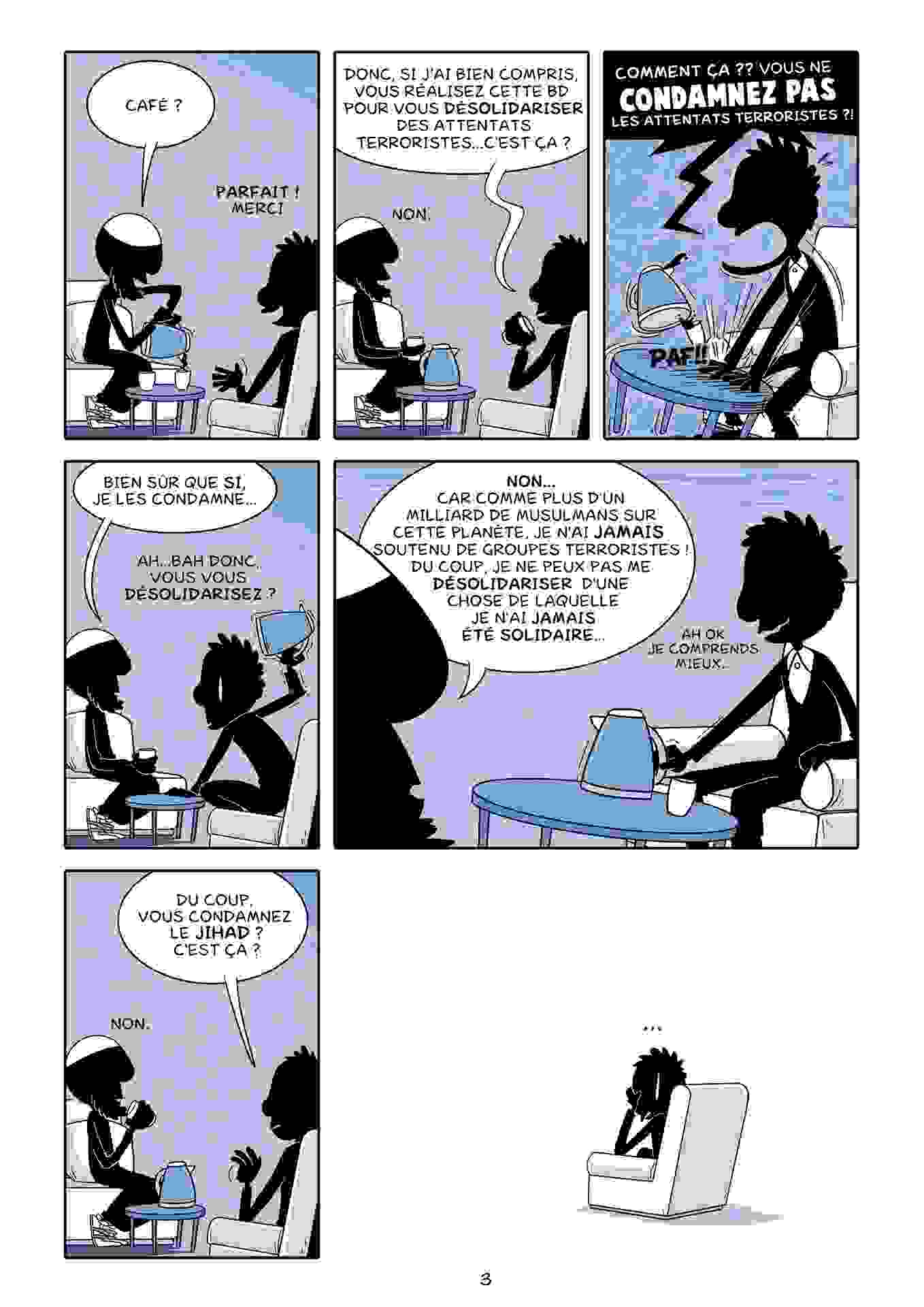 Dans cette nouvelle BD, en cours de financement par une campagne de crowdfunding lancée le 20 novembre dernier, l’idée sera de répondre à des questions d’actualité et souvent entendues comme : Qu’est ce que le djihad ? l’Etat Islamique ? Est-ce que vous vous désolidarisez des attentats ?